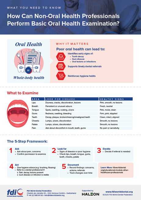 Learn more by reading the Basic Oral Health Examination fact sheet: https://www.fdiworlddental.org/basic-oral-health-examination.